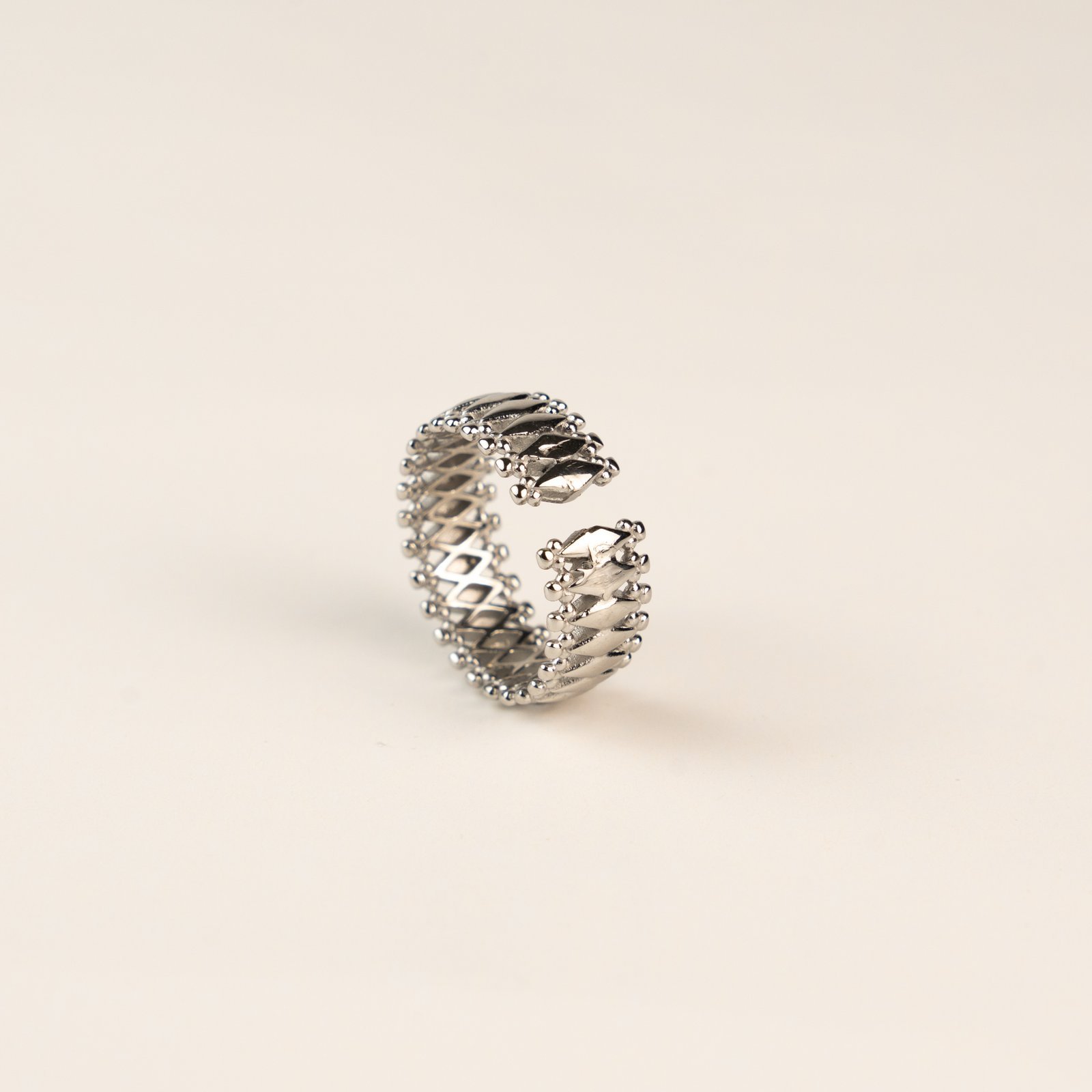 En slank ring med en åben form, hvor den ene ende er formet som et T. T’et er dekoreret med små, skinnende sten, der tilføjer elegance til det moderne og minimalistiske design.